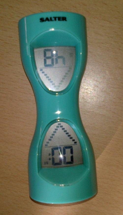 Fun digital kitchen timer which counts up or down, displaying time lapsed in numerals and virtual "sand". Features a choice of 12/24 hour modes, backlight and timer memory function.
