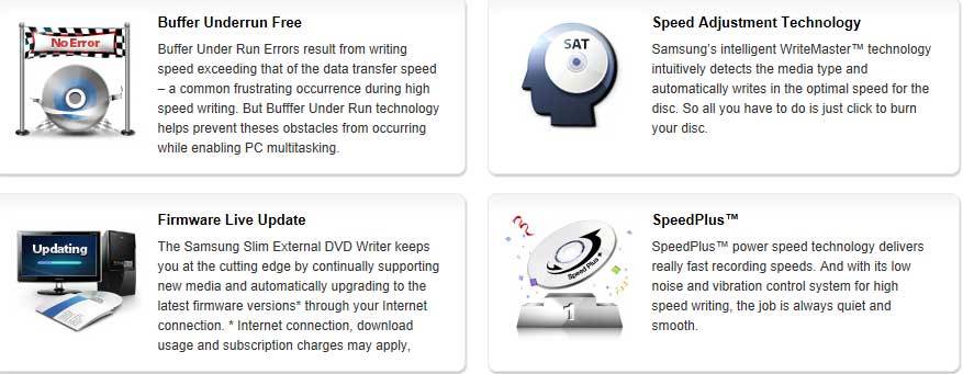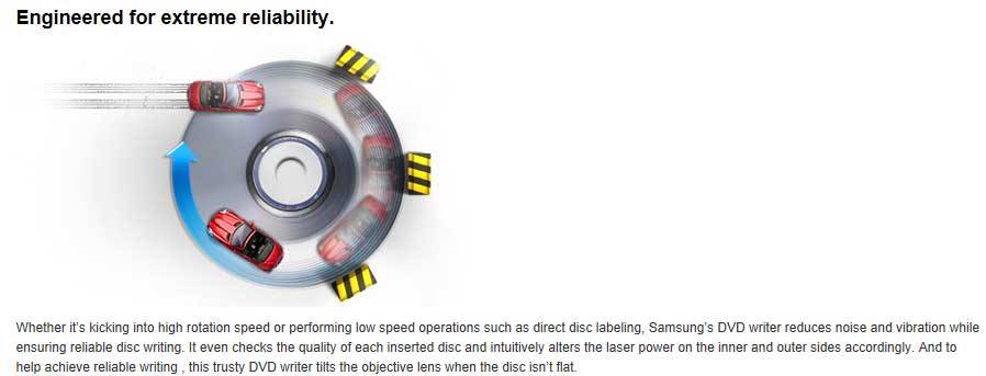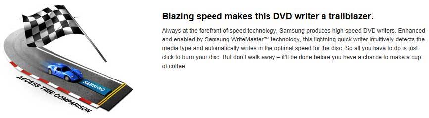 Samsung 22x SATA DVD writer supports powerful over speed performance which allows writing with the high speed of 22x on a low cost 16x media. Our aerodynamic frame design helps to reduce the acoustic noise. You will be amazed how quiet when the drive is running. DVD-R write : 22x (29.7 MB/s).