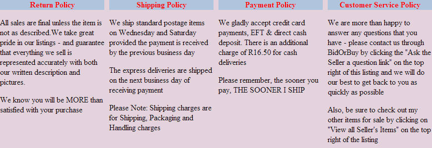 R35.00 Standard shipping using one of our trusted couriers applies to most areas in South Africa. Some areas may attract a R30.00 surcharge. This will be calculated at checkout if applicable.