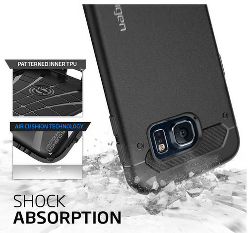 Our line-up takes a step further with the newly designed Rugged Case for the Galaxy S6 Edge. The Rugged Case is a flexible TPU case featuring a mechanical design with technical details, such as the glossy lines and carbon fiber texture, which emanate a rough appeal without being overly bulky. The fit stays exact and slim and includes our trademarked Air Cushion Technology to absorb shock and impacts for protection against drops and falls.