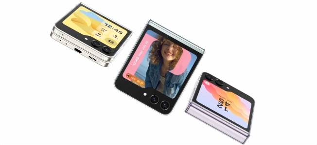 An extreme closeup of a folded Galaxy Z Flip5 seen from the Flex Window and bottom frame. Zooming out, the device opens to stand like a tent.