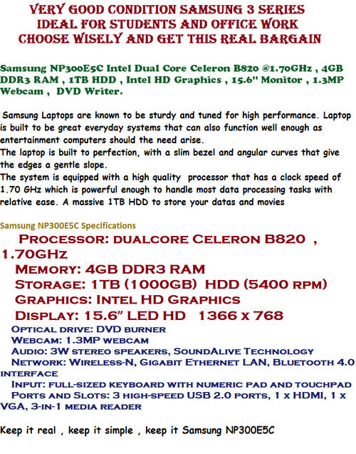 SAMSUNG NP300E5C CELERON DUAL CORE B820,1.70GHZ ,4GB RAM , 1TB HDD , VERY GOOD CONDITION