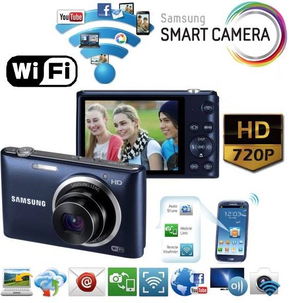 Samsung ST150F 16.2MP Smart WiFi Digital Camera -Fast wide-angle lens with 5x Optical Zoom , 3.0 inch LCD Screen , Capture HD 720p videos at 30fps , Wi-Fi Direct, Email , Face, Blink and Smile Detection , MicroSD memory Card Slot , Retail Box , 1 year Limited Warranty