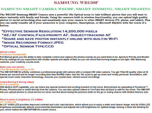 SAMSUNG WB150F SMART Compact Digital Camera with Wi-Fi (14MP ) EXCELLENT CONDITION