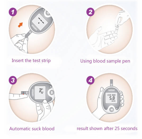 25pcs Blood Taking Needle 25pcs Test Strip For Sannuo Glucometer more information you can click the below picture For Sannuo Automatic Identification Code Blood Glucose Meter Only Sannuo Blood Glucose Meter Glucometer Automatic Identification Code Small compact design, whenever and wherever possible concerned about your health Features: Auto power on Automatic withdrawal strip 220 Sets Memory (average value of 7days/14days/28days) By correcting code automatically selected test curve Bio-Sensor Technology capable to draw blood sample itself from the finger tip Professional and reliable, monitoring self blood sugar for diabetes patients, screening and censusing diabetes Description: Brand Name: Sannuo Measuring Time: 25seconds Range: 2.2-27.8mmol/L(40-500mg/dl) Test Temperature: 10¿¿¿ to ~35¿¿¿ Test Humidity: ≤80% Storage Condition: Temperature: 1¿¿¿ to ~40¿¿¿; Humidity: ≤80% Memory: 220 set memory Power: 2 X AAA Battery (Not including) Package Included: 1 X Sannuo Glucometer 1 X Blood Sampling Pen 1 X Leather Bag Note: 1.The real color of the item may be slightly different from the pictures shown on website caused by many factors such as brightness of your monitor and light brightness 2.Please allow slight deviation for the measurement data 3.Please allow 2-3cm error USING STEP Step 1 Washing hand Step 2 Unscrewing blood sampling pen Step 3 Putting the needle into the blood sampling pen Step 4 Unscrewing the needle protect cover and keep the protect the cover Step 5 Screwing the blood sampling pen Step 6 Adjusting the number for the needle depending on personal situation (1 is for shallowest, 6 is for deepest) Step 7 Pull the back of the pen and it will bounce back Step 8 Taking a test paper Step 9 Insert the test paper Step 10 Pressing C button to adjust the correction code and press I button to save Step 11 Using blood sampling pen to take some blood Step 12 Drawing blood sample Step 13 The result shown after 25 seconds Step 14 Disposing of waste correctly Step 15 Putting the protecting cover on needle and disposing medicine waste correctly