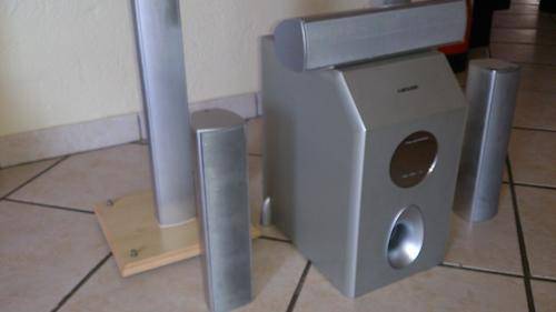 Has 2x 'tall boy' type speakers, 2x front speakers, 1x centre speaker and the control/sub woofer box.