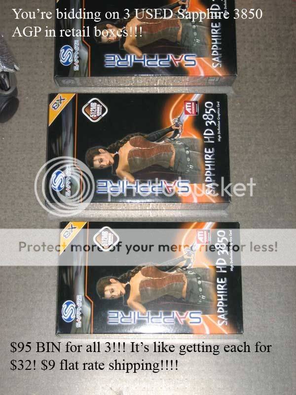 You are buying a NEW "Sapphire HD 3850 512MB DDR3 AGP 8X Retail Video Card". This retail video card comes with the card itself (single slot fan), driver CD, 1 DVI-to-VGA adapter, 1 PCIe power adapter, component cable, S-Video to composite adapter, and the retail box. Please see pictures for details. The item will be shipped in a sturdy box to ensure it retains its condition shown here. Please see Payment and Shipping Information on bottom.