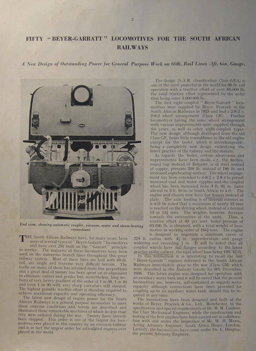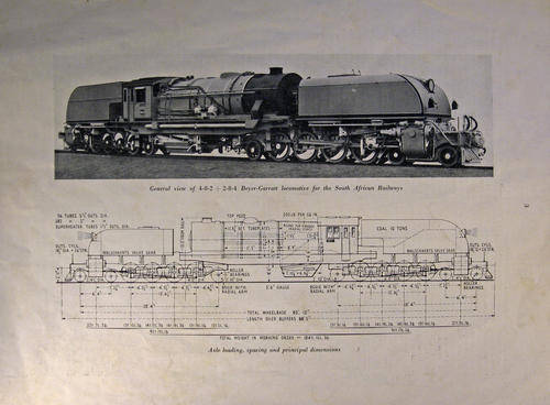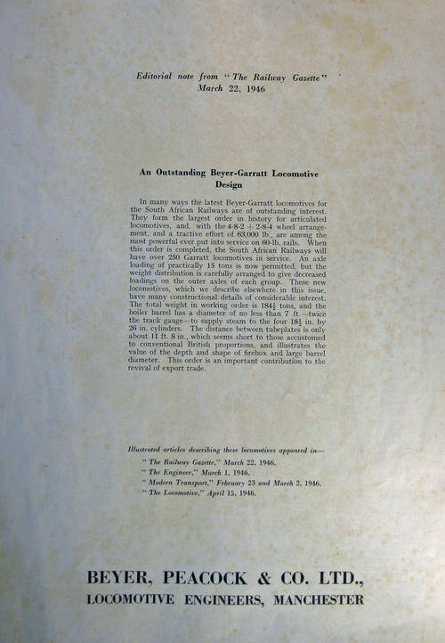 This 1946 booklet is a technical, 8-page promotional brochure on the 50 Beyer Peacock Class GEA locomotives supplied to the SAR. The brochure is intact although it does show signs of use and has a light brown mottling on some pages. It is slightly larger than A4. Allow R30 for counter-counter postage in SA.