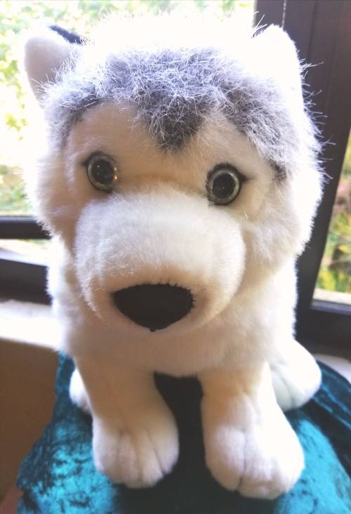 Sasha the Husky. Beautiful and super soft! Air-brushed details on the super soft, grey and white fur. Pearly blue and black, plastic eyes and leathery nose with black stitched mouth.