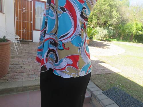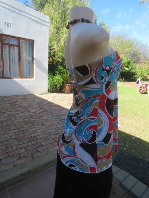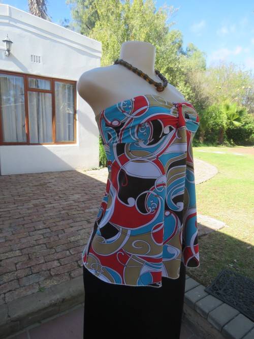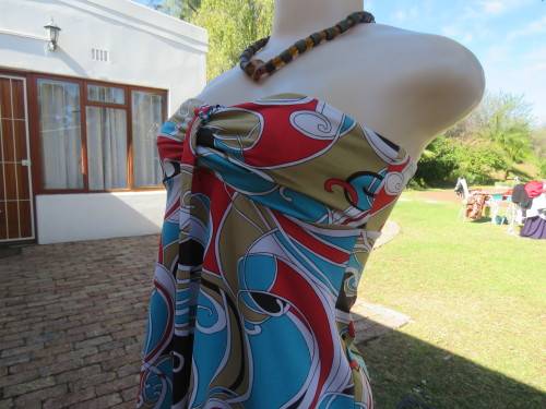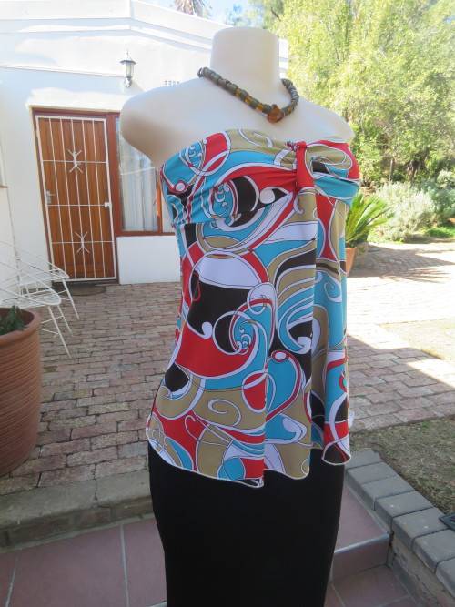 Sassy little strapless top in size 30/6 by W.W.W.In stretch polyester fabric.In graphic design in red,blue,white and black colours.Gathered bust area with elasticated back.As new.