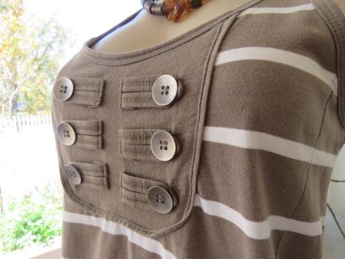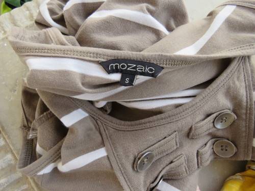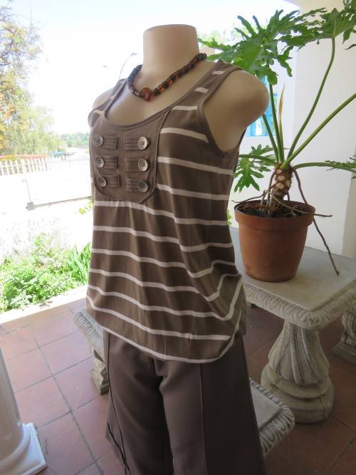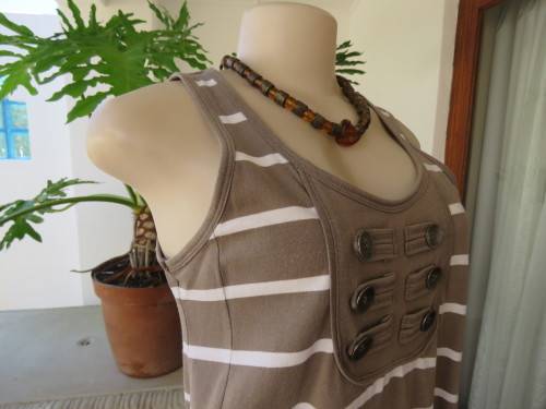 Sassy sleeveless top in ecru and white horizontal stripes by 'MOZAIC' in 32/8 with band around hips.Rounded neckline with unique bib decoration on front with 6 metal buttons.As new.