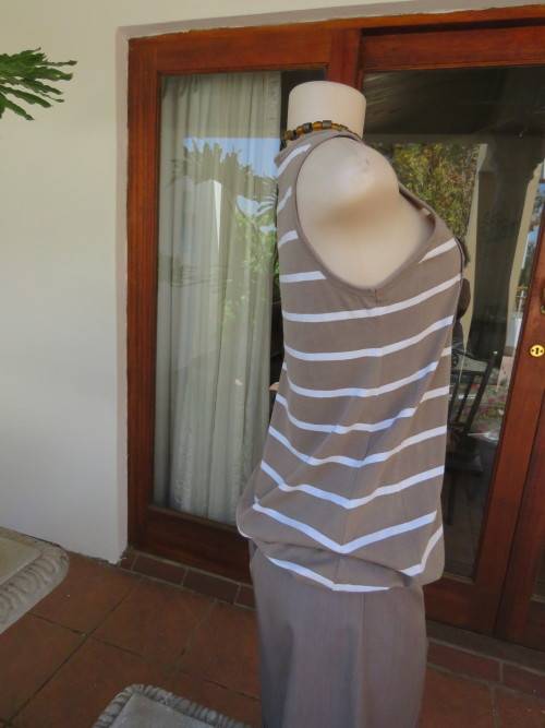 Sassy sleeveless top in ecru and white horizontal stripes by 'MOZAIC' in 32/8.As new.