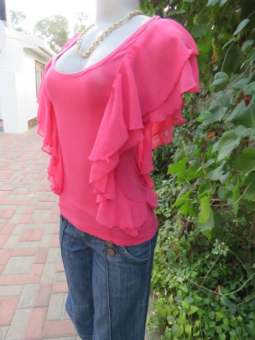 Savvy styled crimson colour top in size 30/6 by 'LEGIT'.In polyester with very little stretch.Sleeveless with sheer polyester double frills on shoulders right down at both sides.Good cond.
