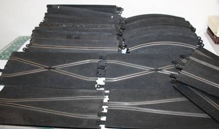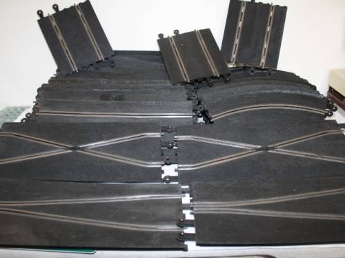 19 straights,18 curves,3 short curves,4 'cross overs',set 'turn around',lap counter,hand controls,barriers etc..see photos