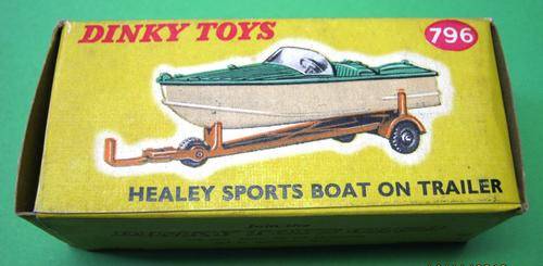 MINT AND BOXED NO 796 MECCANO DINKY HEALY SPORTS BOAT ON TRAILER. BOAT PERFECT. BOX EXCELLENT. ALL FLAPS PRESENT AND IN GREAT SHAPE. THIS IS A VERY SCARCE ITEM.