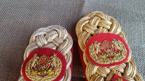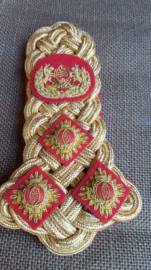 Here on auction we have a scarce and rarely seen pair of scarce "ceremonial" dress 1 Botswana BDF Brigadier officers rank bullion wire shoulder boards with bullion wire pips - a difficult and rare find indeed!