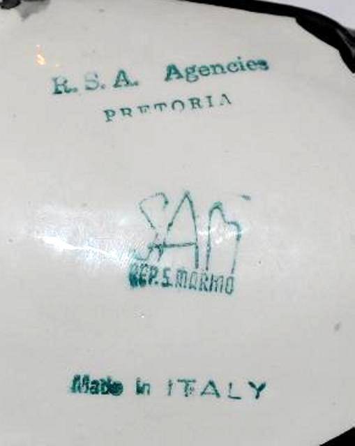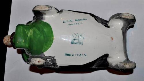 An automobile liquor decanter made in Italy c.1960's? Not uncommon but this particular one is stamped "R.S.A. Agencies Pretoria". Also interesting is the stamp for the Republic of San Marino known as the oldest surviving sovereign state. This state is surrounded by Italy and is just over 61 Square km in size. I could find no cracks or chips. Length of the decanter is about 220mm without the cork. Postage R 41.