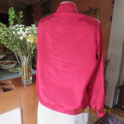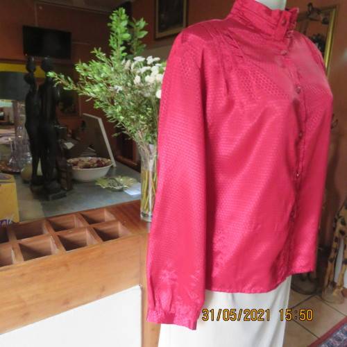 Top of the line scarlet red vintage blouse by DARLING from London. In silky polyester with tiny hexagon designs. Long cuffed sleeves. High folded collar and button down front. As light as a feather. Tucked seams on both shoulder fronts. Size 38 to 40. New condition.
