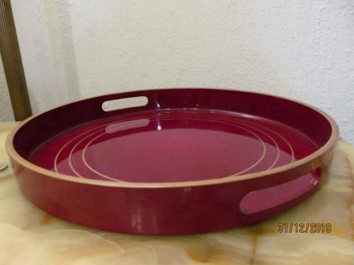 THE TRAY IS HOWEVER VERY STURDILY CONSTRUCTED AND APPEARS TO BE AS A SINGLE UNIT WITH NO JOINTS ALONG THE ELEVATED GALLERIED SIDES WHICH WOULD LEAD ME TO GUESS THAT THE ITEM IS A FORM OF BAKELITE. A PAIR OF HANDLES HAVE BEEN CREATED AT OPPOSITE ENDS WITHIN THE SIDE AND THE ENTIRE TRAY SURFACE IS A METALLIC FORM OF SCARLET OR RUBY RED WITH GOLD ALONG THE RIM AND A TRIO OF GOLD CIRCLES AROUND THE CENTER. THE BASE OF THE TRAY IS BLACK