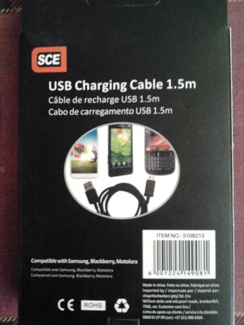 SCE USB charger cable compatible with Samsung, Huawei, Sony, HTC, Blackberry, Motorola, etc. Cable is 1.5 metres long.
