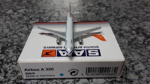 Schabak 926/8 Airbus A320-231 SAA South African Airways 2nd version in early 1990's colours, Registration ZS-SHA issued in 1993 deleted in 2000 Mould Type IV, Plane is mint as is the picture box. Lovely Model in 1:500 scale measures 6.26cm from nose to tail and 5.68cm from wing tip to wing tip.
