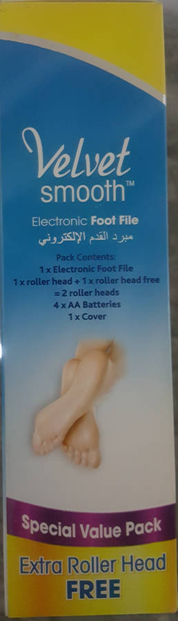 Detailed Description: Get feet that look great and feel super smooth without any hassle. Velvet Smooth™ buffs away hard skin in minutes leaving you with fabulous feet that you'll want to show off. It's so easy to use. Gently rotate the file over hard skin and see the dead skin disappear. Once your feet are smooth and soft again breathe a sigh of relief. Ergonomically shaped soft touch handle. Specially-designed Micralumina™ replaceable head. Gentle & effective rotating action. Battery operated. Ready to use. Reckitt Benckiser. Scholl and the Scholl logo are trade marks of the Reckitt Benckiser Group. www.scholl.com.