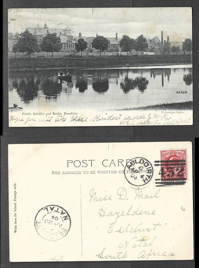 Scotland Public Schools and Baths Dumfries used 1d, AULDGIRTH AP 4 04-432 duplex> ESTCOURT NATAL