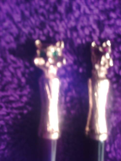 Scottish terrier and cat, ladies pen set collector's item cat has emerald eyes and terrier has ruby eyes comes in its original case pens are two inch long slightly bigger than a Zippo lighter dog and cats heads are metal with gold plate. both in excellent writing condition.