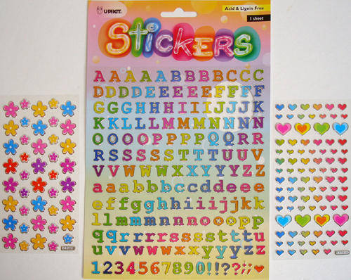 An assortment of silver-edged rainbow-coloured Alphabet, flower and heart stickers