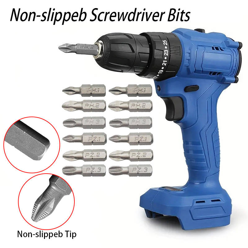Various screwdriver bits - This set comes with 12 crosshead screwdriver bits (PH1, PH2, PH3, PZ1, PZ2, PZ3) that serve as excellent add-ons for screwdrivers or drills.