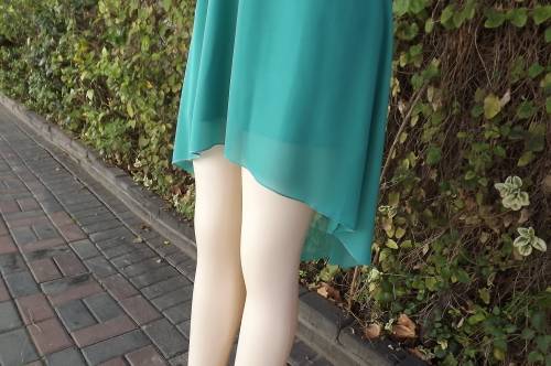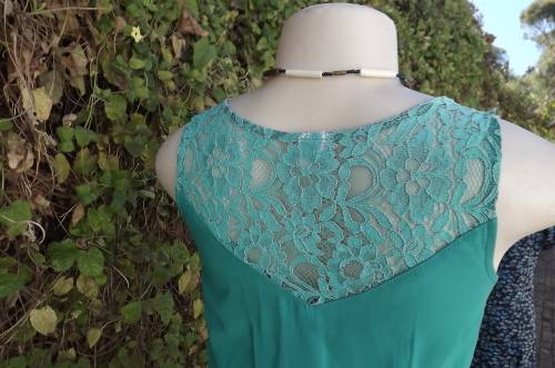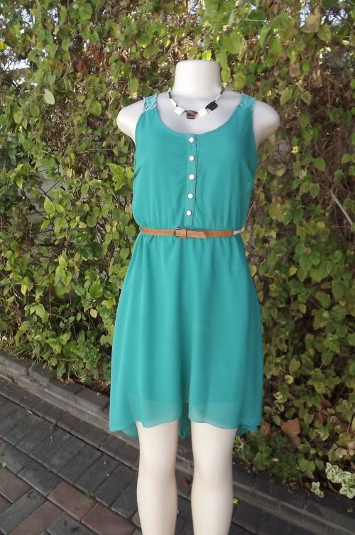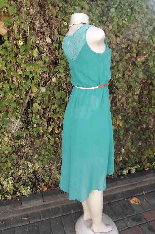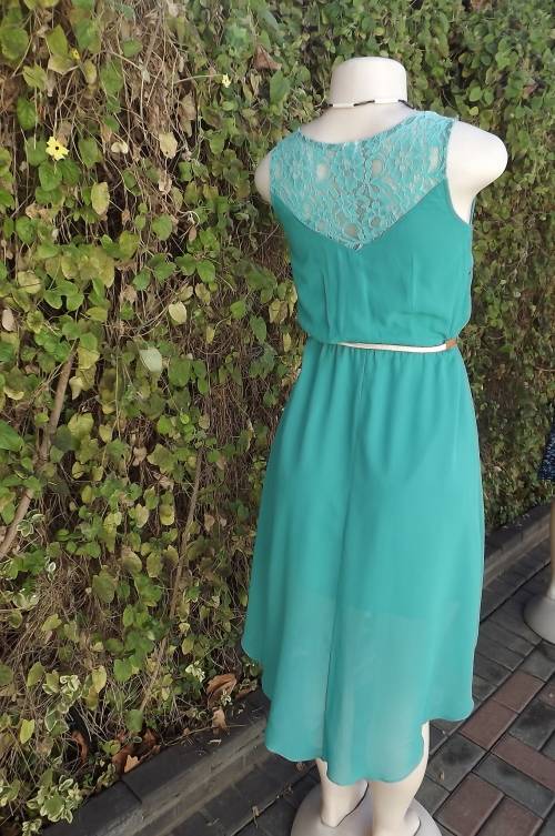 Seagreen dress with high/low seam.Low rounded neckline with button down top.Size 28/4.Bust 80cm.Fully lined.Lace yoke at back and on shouers.In 100% polyester fabric.Good condition.