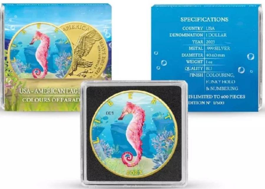 The latest edition of American Eagle has been plated in gold, colored on one side and ennobled with a Funky holo effect, giving the coins a new and unique design.
