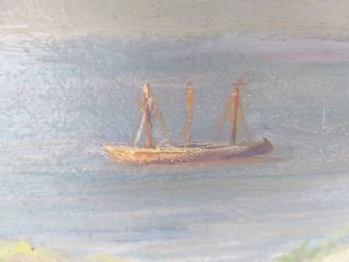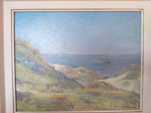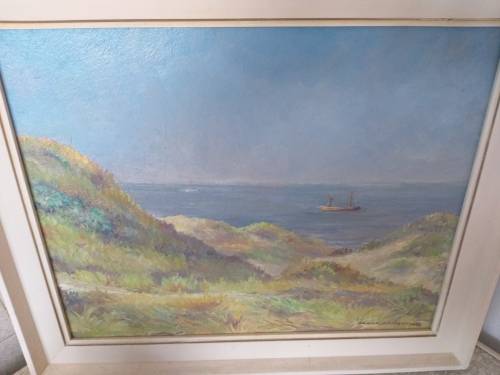 Stunning seascape with rolling hills oil on board and framed. Signed by artist and dated 75. Painting measures 48 x 38(excl frame)
