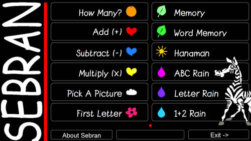 Sebran's ABC is a collection of 12 different activities for kids 4-9 years old. It includes counting games, a Hangman game, Memory games, typing games and much more.