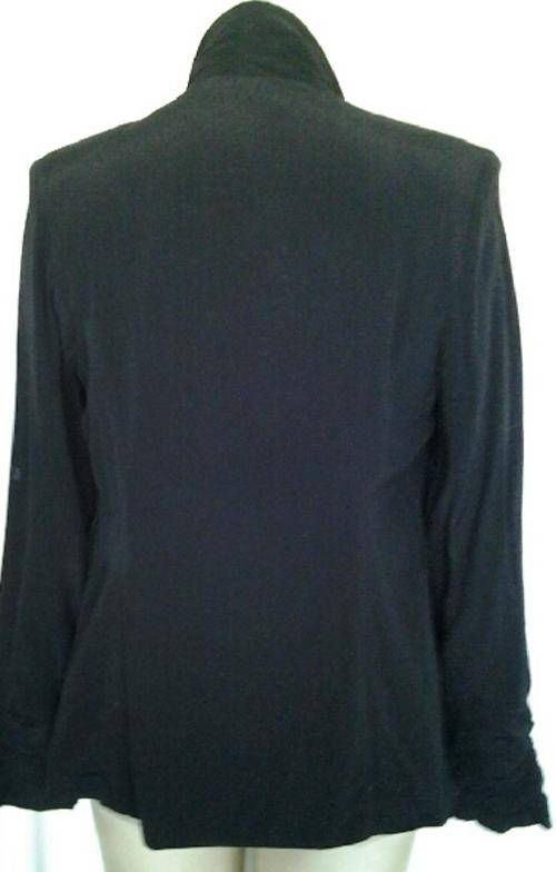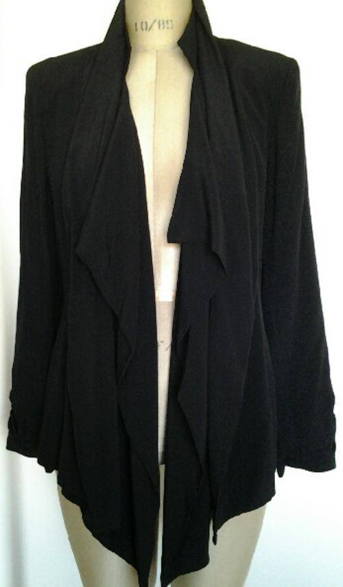 Description | Fully lined soft blazer with waterfall styled collar and elastic gathered cuffs. Has thin shoulder pads. |