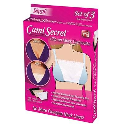 Create a layered look without the bulk! Cami Secret looks just like a camisole, but is much more stylish and lightweight. With a pretty lace border and specially designed clips that attach right to your bra straps, Cami Secret slides up and down so you control the coverage. Adjust the neckline of low-cut tops, sweaters, and dresses. Expand your wardrobe and add a touch of color instantly. Made of a breathable, washable material. Set of three includes white, black and beige. Polyester. Imported.