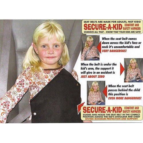 The Secure-A-Kid Comfort and Safety Harness guides and holds the seat belt in the correct position across the child's shoulder and chest giving maximum protection and support! Ideal for small adults too!