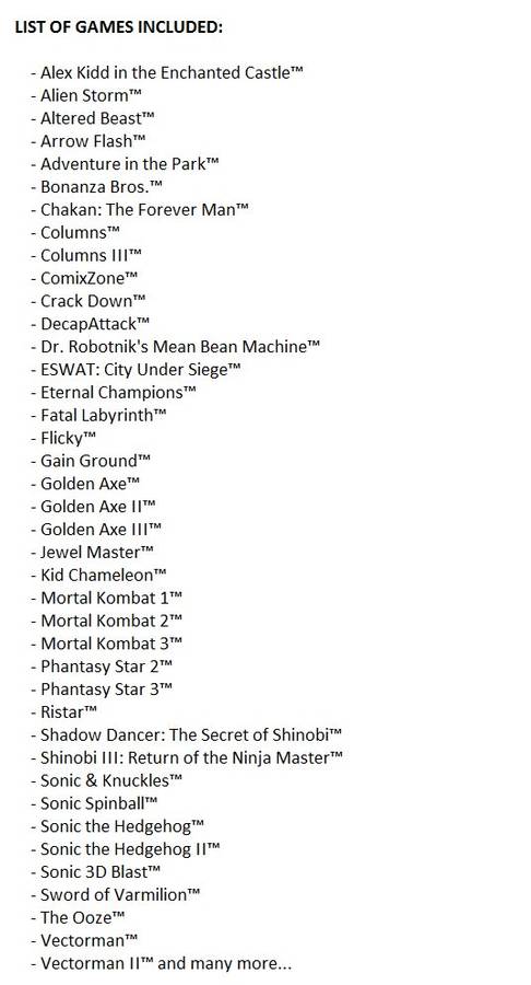 Alex Kidd in the Enchanted Castle, Alien Storm, Altered Beast, Arrow Flash, Bonanza Bros., Chakan: The Forever Man, Columns, Columns III, ComixZone, Crack Down, DecapAttack, Dr. Robotnik's Mean Bean Machine, ESWAT: City Under Siege, Eternal Champions, Fatal Labyrinth, Flicky, Gain Ground, Golden Axe, Golden Axe II, Golden Axe III, Jewel Master, Kid Chameleon, Phantasy Star 2, Phantasy Star 3, Ristar, Shadow Dancer: The Secret of Shinobi, Shinobi III: Return of the Ninja Master, Sonic & Knuckles, Sonic Spinball, Sonic the Hedgehog, Sonic the Hedgehog II, Sonic 3D Blast, Sword of Varmilion, The Ooze, Vectorman, Vectorman II, Mortal Kombat 1, Mortal Kombat 2, Mortal Kombat 3, Adventure in the Park
