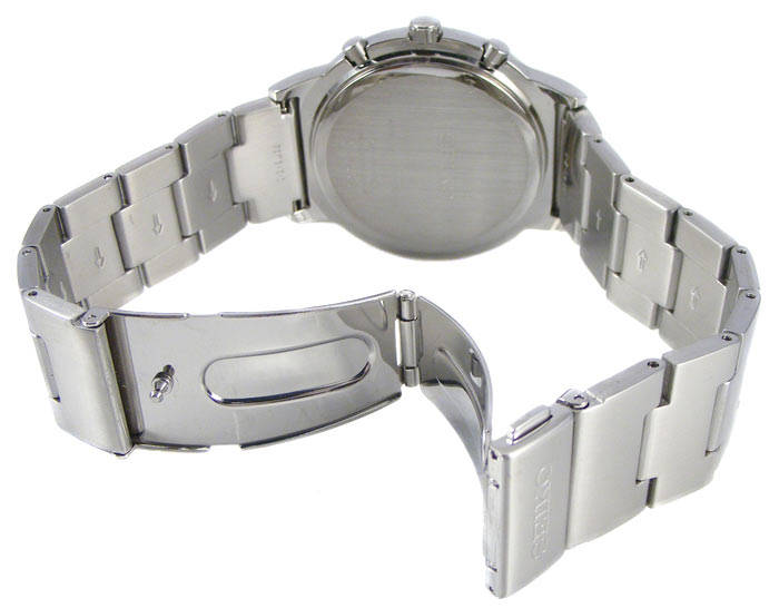 Brushed stainless steel bracelet with a dual push button release deployment clasp.
