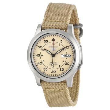 Stainless steel case with a beige canvas strap. Fixed stainless steel bezel. Beige dial with luminous hands and Arabic numeral hour markers. Arabic numeral minute markers (at 5 minute intervals). Minute markers around the outer rim. Dial Type: Analog. Luminescent hands. Day of the week and date display at the 3 o'clock position. Automatic movement with a 40-hour power reserve. Scratch resistant Hardlex crystal. Pull / push crown. Skeleton case back. Case diameter: 37 mm. Case thickness: 11 mm. Round case shape. Band width: 18 mm. Tang clasp. Water resistant at 100 meters / 330 feet. Functions: date, day, hour, minute, second. Additional Info: suitable for snorkeling, as well as swimming, but not diving. Casual watch style. Seiko 5 Beige Dial Beige Canvas Mens Watch SNK803.
