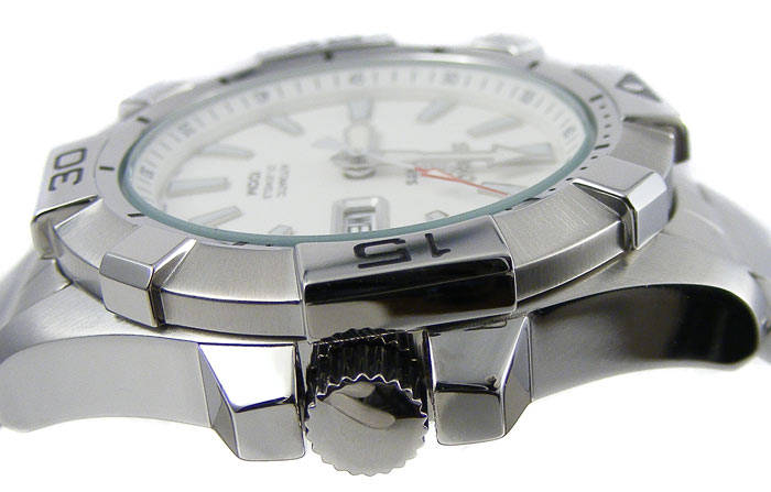 Unidirectional rotating stainless steel bezel with elapsed minute scale for set timekeeping.