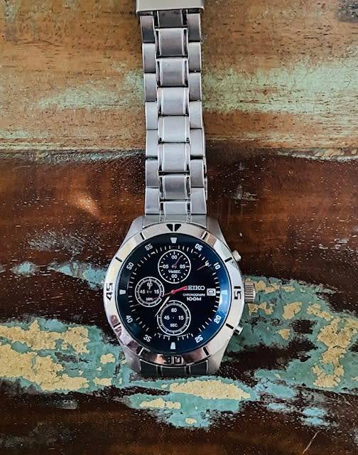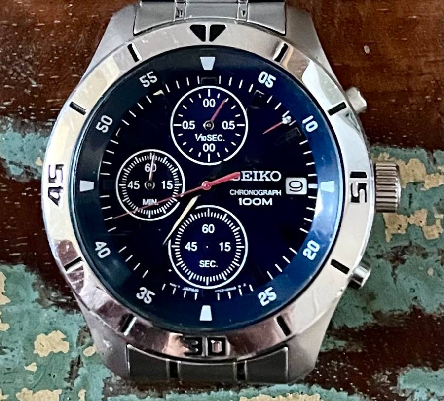 SEIKO CHRONOGRAPH MENS WATCH INCLUDING BOX. THE SECONDS HAND AND HOUR HAND CAME LOOSE AND NEEDS TO BE CLIPPED BACK ON. TO DO THIS AT A WATCH REPAIR SHOP WILL NOT COST MUCH. THE WATCH NEEDS A BATTERY BEFORE IT WIL TICK