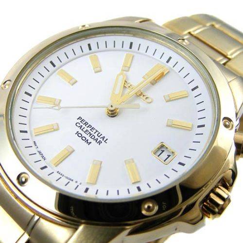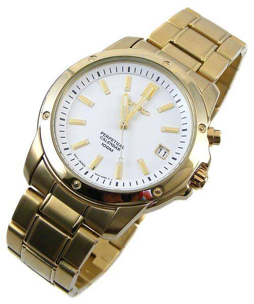 We currently have the largest range of local Seiko and Citizen watches on bidorbuy, all in stock and ready to ship! No import duties, no long waiting period! Your new watch could be on your wrist in less than 48 hours! Click on the SEIKO logo below to view our range! 100% Authentic, including Seiko manual, Seiko presentation case and a 12 month dealer warranty! SEIKO PERPETUAL CALENDAR 100M GOLD TONE SNQ012 6A32 BATTERY POWERED QUARTZ CALIBER ![]() Lumibrite hands and markers for good visibility in dark conditions. Scratch resistant Hardlex crystal glass. Perpetual date window at the 3 o'clock position automatically adjusts for odd and even months and leap years, indicating the year, month and date. Solid stainless steel case in a brushed and polished gold toned finish. Screw in stainless steel case back. Water resistance-100m/10bar. Case measurement 38mm excluding and 41mm including crown x 9mm.