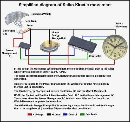 Kinetic energy generated by arm movement is converted to electrical energy and stored in a special power cell.