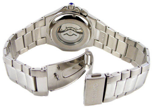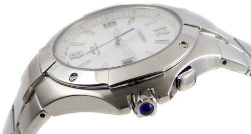 Stainless steel case with brushed and polished finishes and blue cabochon crown.