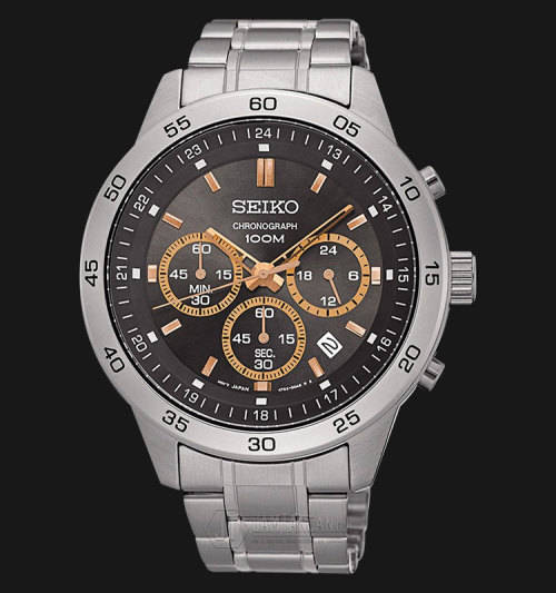 Features: Stainless steel case & bracelet, chronograph function, mineral crystal, black dial, solid case back, deployment clasp, 100m water resistance, case diameter 44mm
