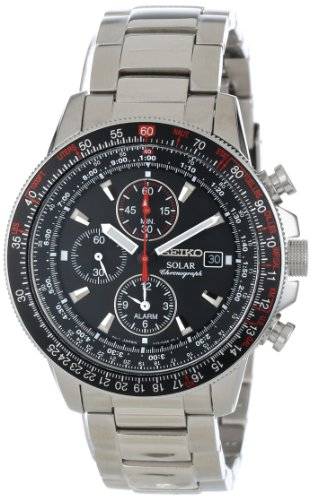 Stainless steel case with a stainless steel bracelet. Bi-directional rotating black ion-plated bezel. Black dial with luminou hands and index hour markers. Tachymeter markings. minute markers around the outer rim. Dial Type: Analog. Luminescent hands and markers. Date display at the 3 o'clock position. Chronograph - three sub-dials displaying: 60 second; 60 minute and 12 hour (alarm). Solar movement. Scratch resistant hardlex (used for seiko only) crystal. Solid case back. Case diameter: 42 mm. Case thickness: 12 mm. Round case shape. Band width: 19 mm. Deployment clasp with push-button. Water resistant at 100 meters / 330 feet. Functions: chronograph; date; hour; minute; second. Sport watch . Seiko Solar Black Dial Chronograph Stainless Steel Mens Watch SSC007.