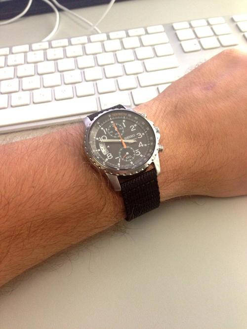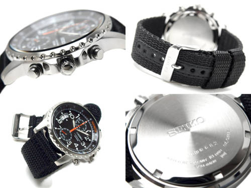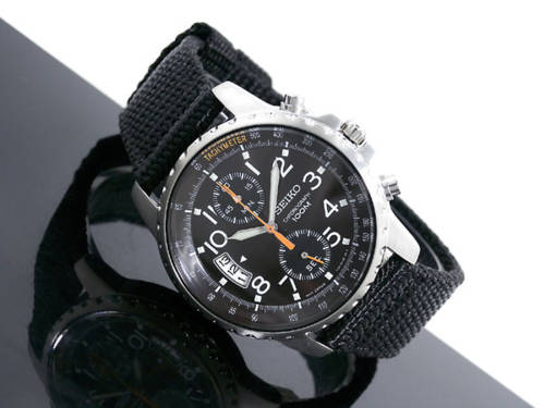 Stainless steel case with a black cloth strap. Fixed stainless steel bezel. Black dial with luminous hands and Arabic numeral hour markers. Minute markers. Tachymeter around the outer rim. Luminescent hands and markers. Date display at the 9 o'clock position. Chronograph - two sub-dials displaying: 60 seconds and 60 minutes. Quartz movement. Scratch resistant Hardlex crystal. Solid case back. Case diameter: 42 mm. Case thickness: 10 mm. Tang clasp. Water resistant at 100 metes / 330 feet. Seiko Chronograph Stainless Steel Cloth Strap Men's Watch SNN079P2.