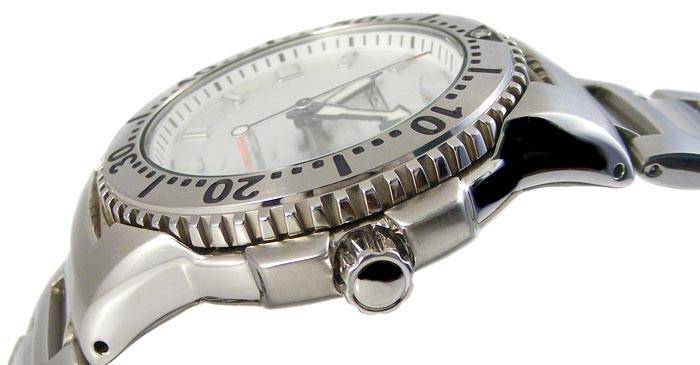Unidirectional rotating stainless steel bezel with elapsed minute scale and Lumibrite zero marker.