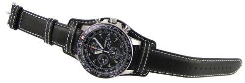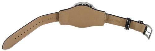 Genuine Seiko calf leather band with stainless steel buckle and removable wrist backing.